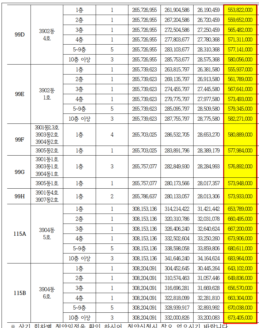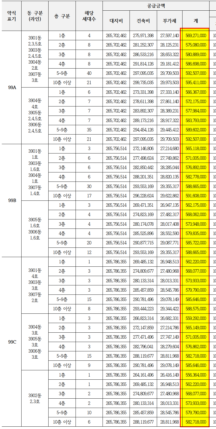- 전용 99m2 : 5억5382만2천원 ~ 5억6541만1천원