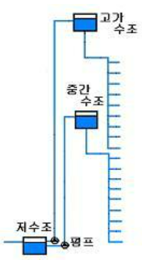 구간을 저층부와 고층부로 구분한 후 고층부용 중간펌프 및 수조를 별도로 설치하여 감압하는 방식이다.(그림 4)