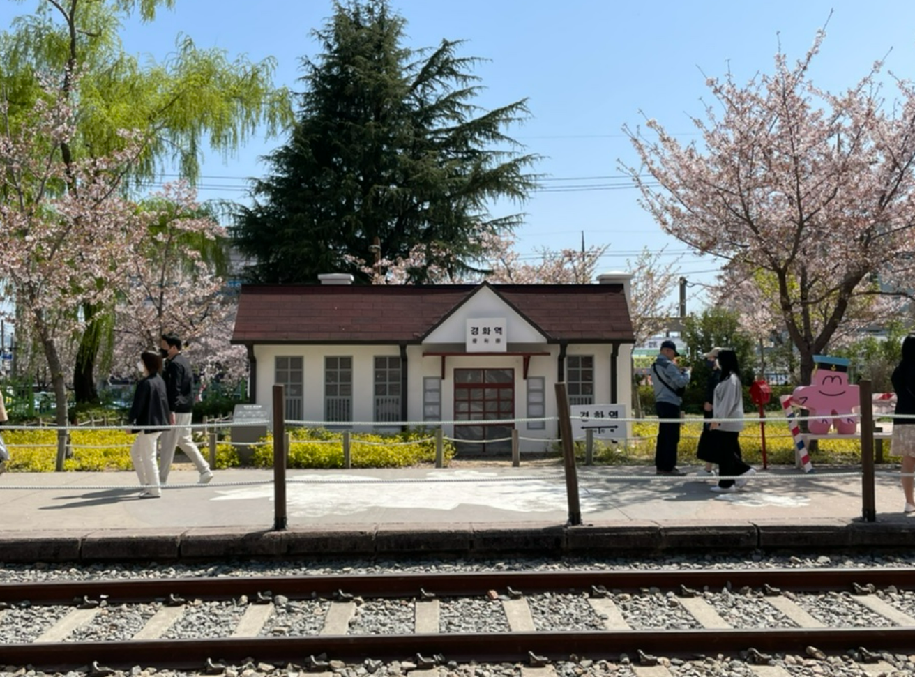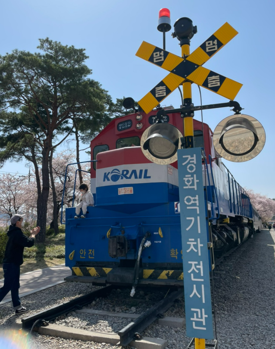 - 기차와 어우러진 벚꽃을 배경으로 사진 찍기