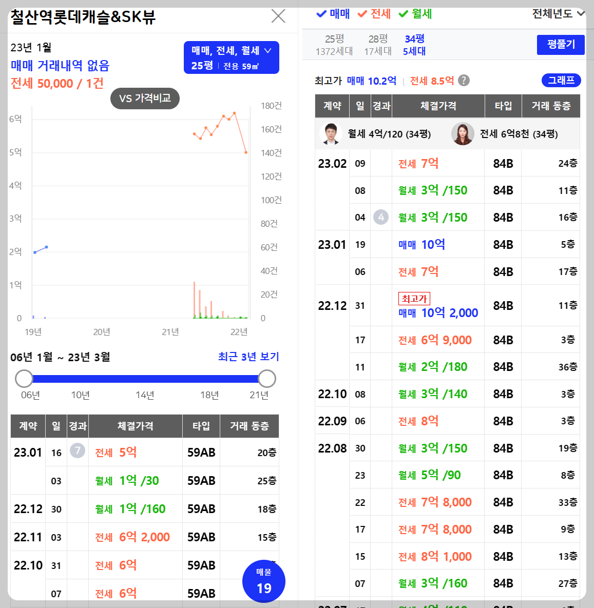 철산역 롯데캐슬&SKVIEW클래스티지 (출처 : 호갱노노 & 아실_2023.03.07)