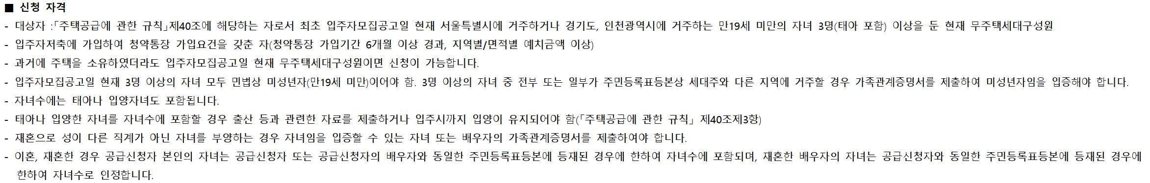 - 대상 : 입주자모집공고일 기준 서울특별시, 인천 또는 수도권 거주, 만 19세 이상 누구나 청약가능
