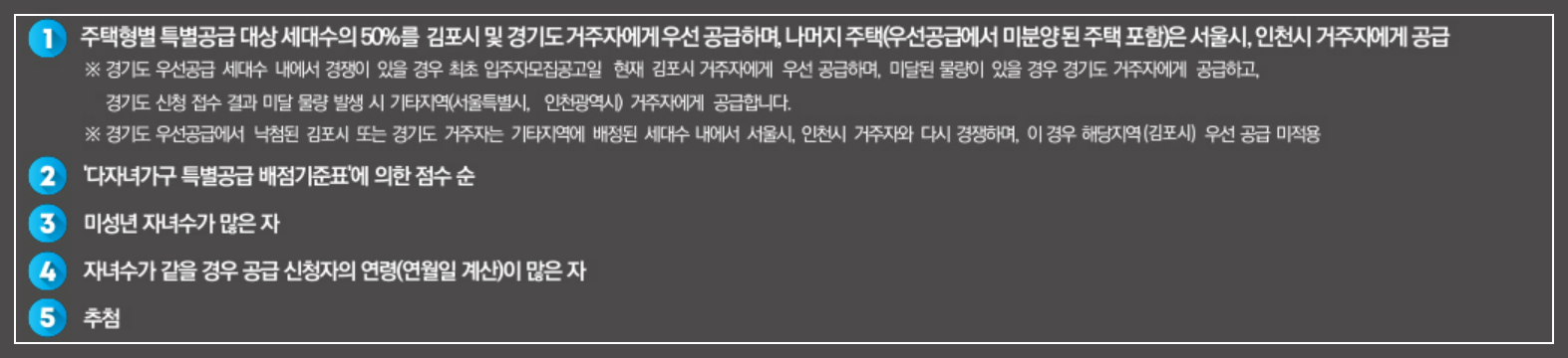 - 특별공급 주택을 분양받고자 하는 자는 주택공급에 관한 규칙 제 55조에 따라 한 차례에 한정하여 1세대 1주택의 기준으로 공급이 가능하고 당첨자로 선정된 경우에는 향후 특별공급에 신청할 수 없으며, 중복 신청할 경우 전부 무효 처리됨 (주택공급에 관한 규칙 제36조 제1호 및 제8호의2에 해당하는 경우는 특별공급 횟수 제한 제외)