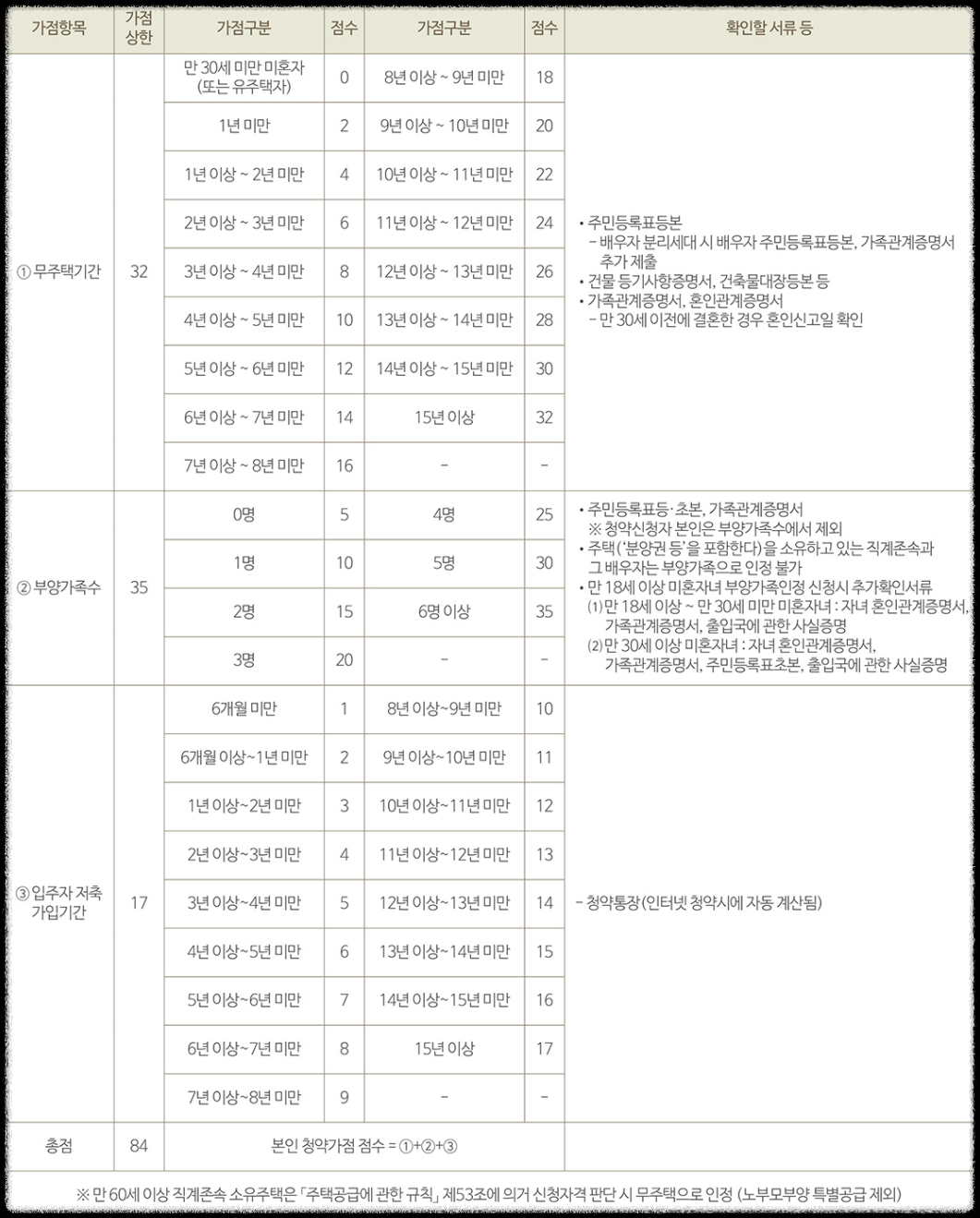 - 무주택기간 32점, 부양 가족수 35점, 청약통장 가입기간 17점 : 총 84점