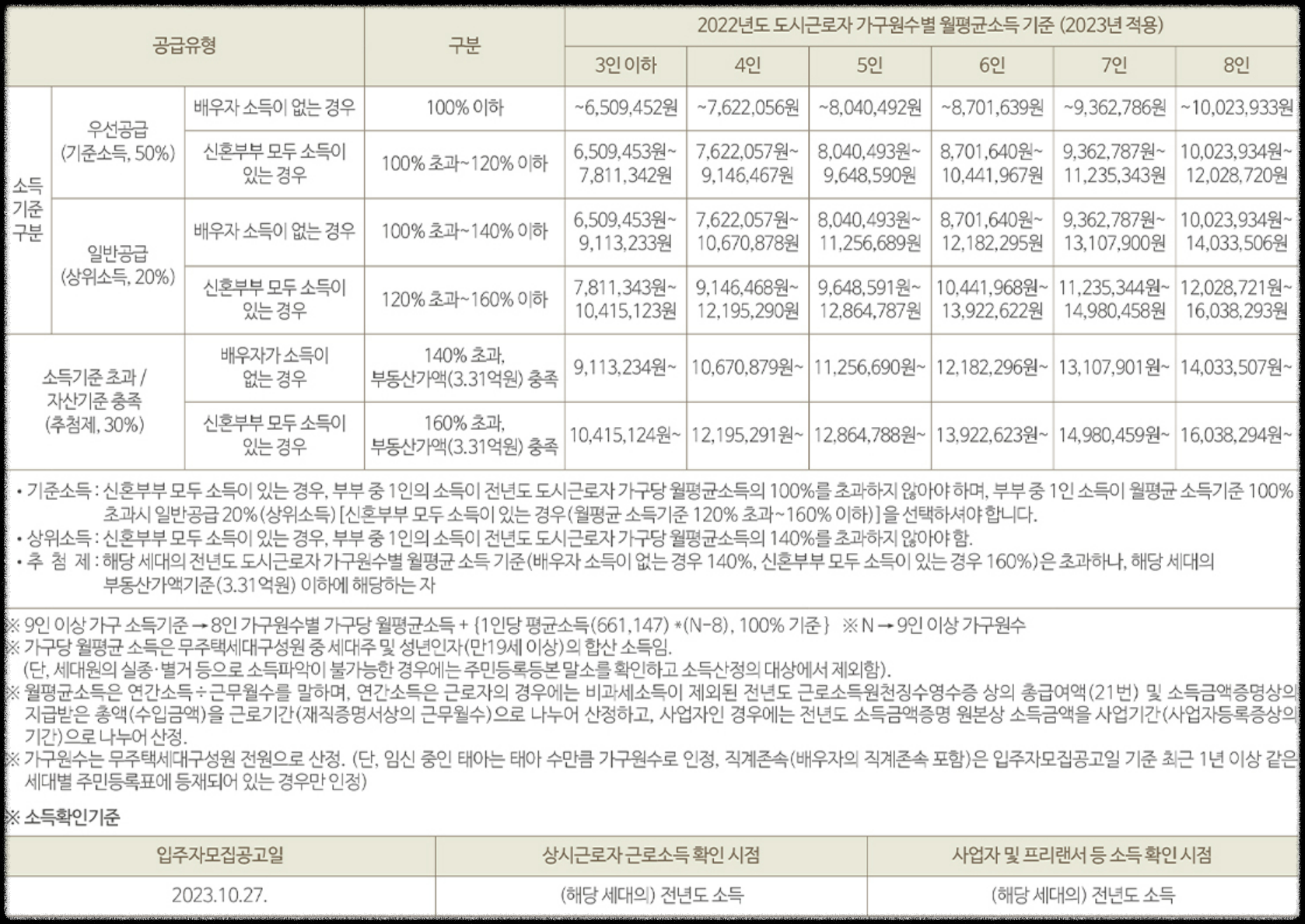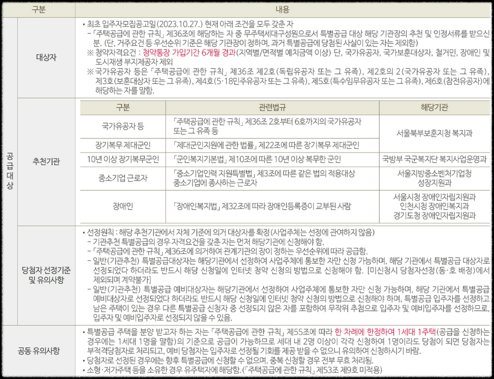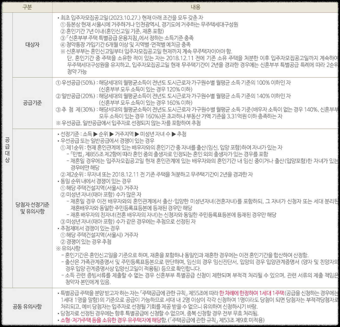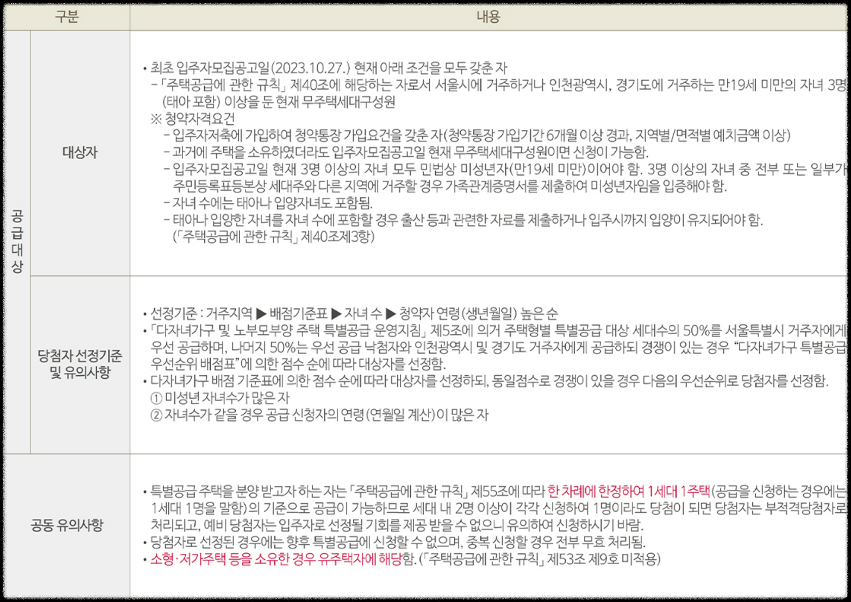 - 입주자모집공고일 기준, 입주자저축 가입자와 동일한 주민등록표에 등재된 세대원 전원이 무주택이어야 함. (배우자 직계존속, 직계비속의 배우자 포함)
