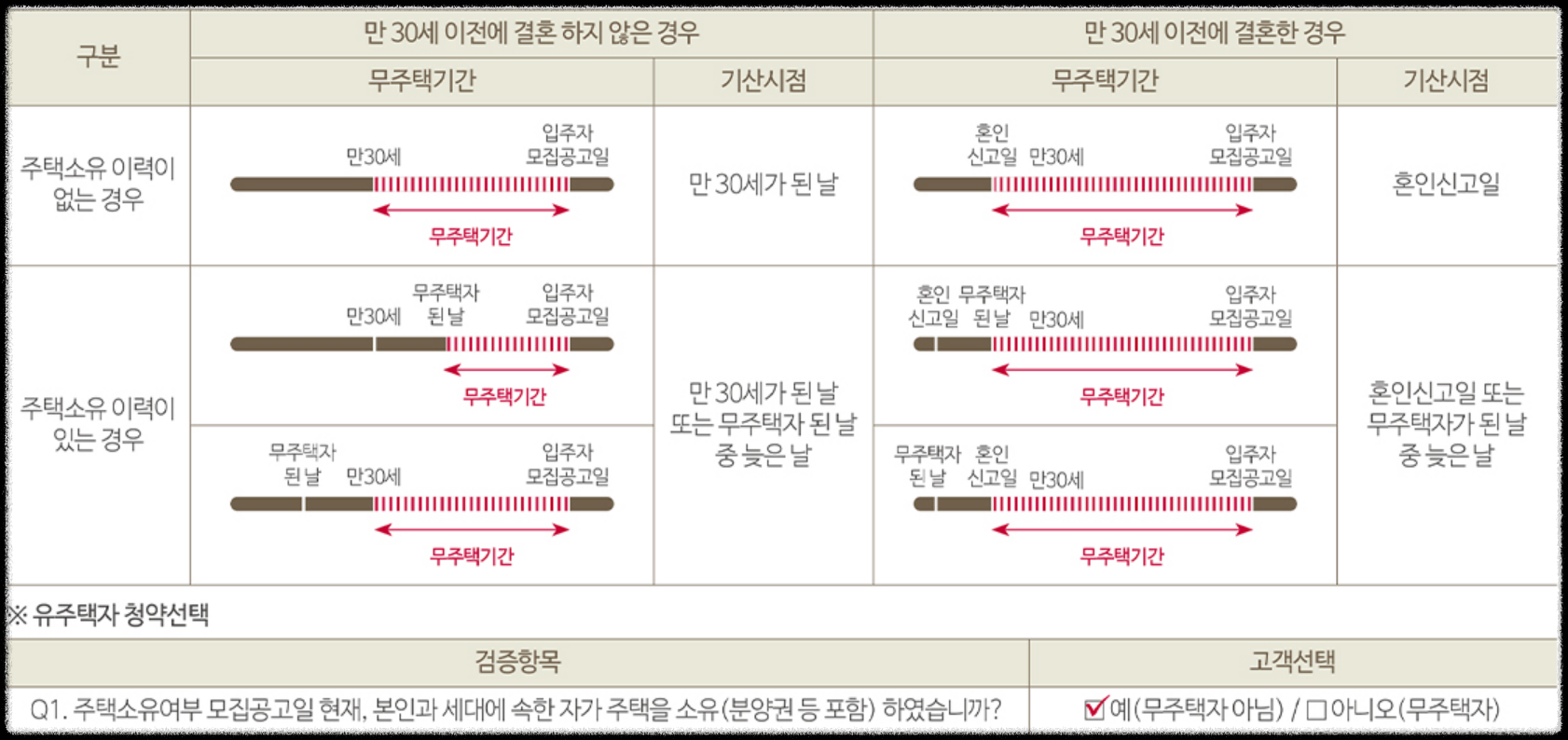 - 무주택기간은 청약자 및 배우자를 대상으로 산정하며 주택을 소유한 적이 없는 경우 만 30세부터 산정. 만 30세 이전 혼인한 경우 혼인신고일로부터 산정.
