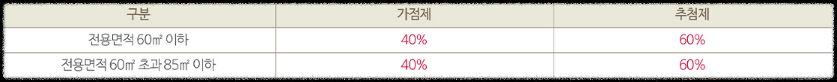 - 동일순위 내에서 경쟁이 있을 경우 무주택기간, 부양가족수, 청약통장 가입기간을 기준으로 가점점수를 산정하여 높은 순으로 당첨자를 선정하는 제도입니다.