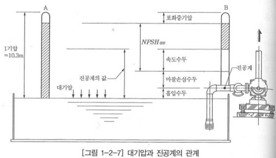 펌프에 의해 배관내 형성되는 진공도는 이를 수두로 Hp(m)라 하면 10.3 - (Hh + Hf + Hv) > Hp가 되어야 한다.